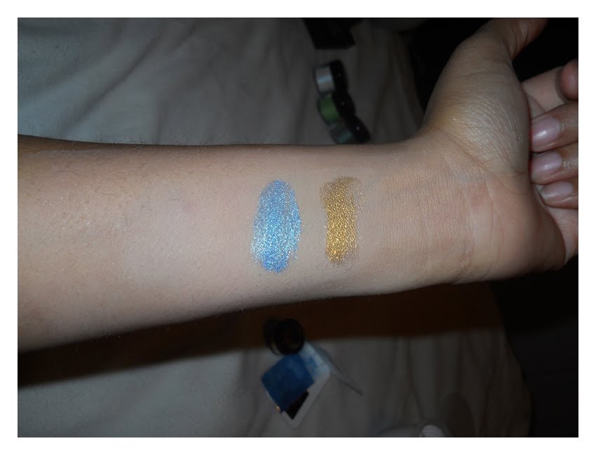 With My order I also received a Sugarpill sticker, flyer and sample of the loose eyeshadow named Starling. Starling is a beautiful and vibrant sparkling turquoise. I got so excited that I decided to also dig out my sample of of Goldilux loose eyeshadow which is a beautiful sparkling true gold that is unlike any other gold that I have, it is very beautiful.